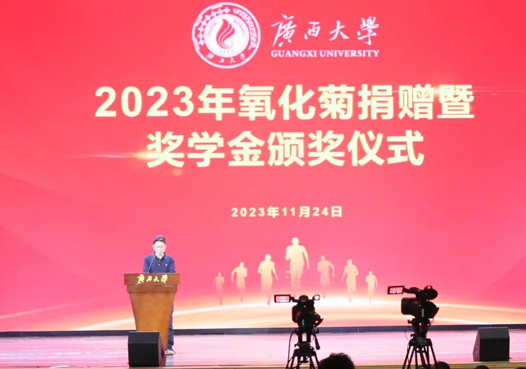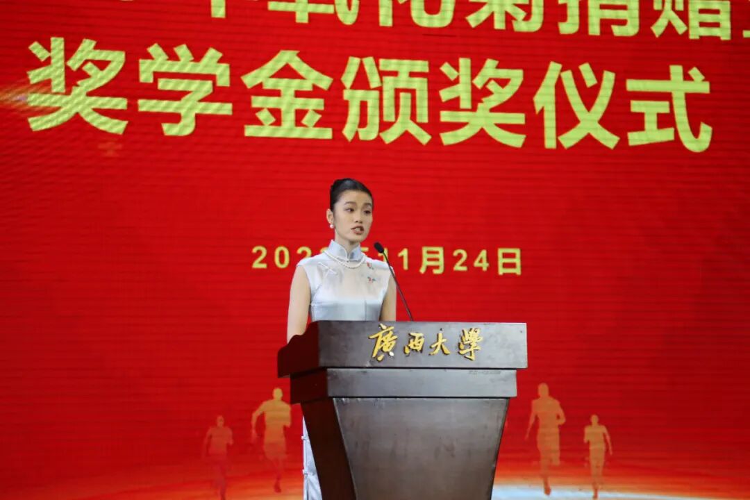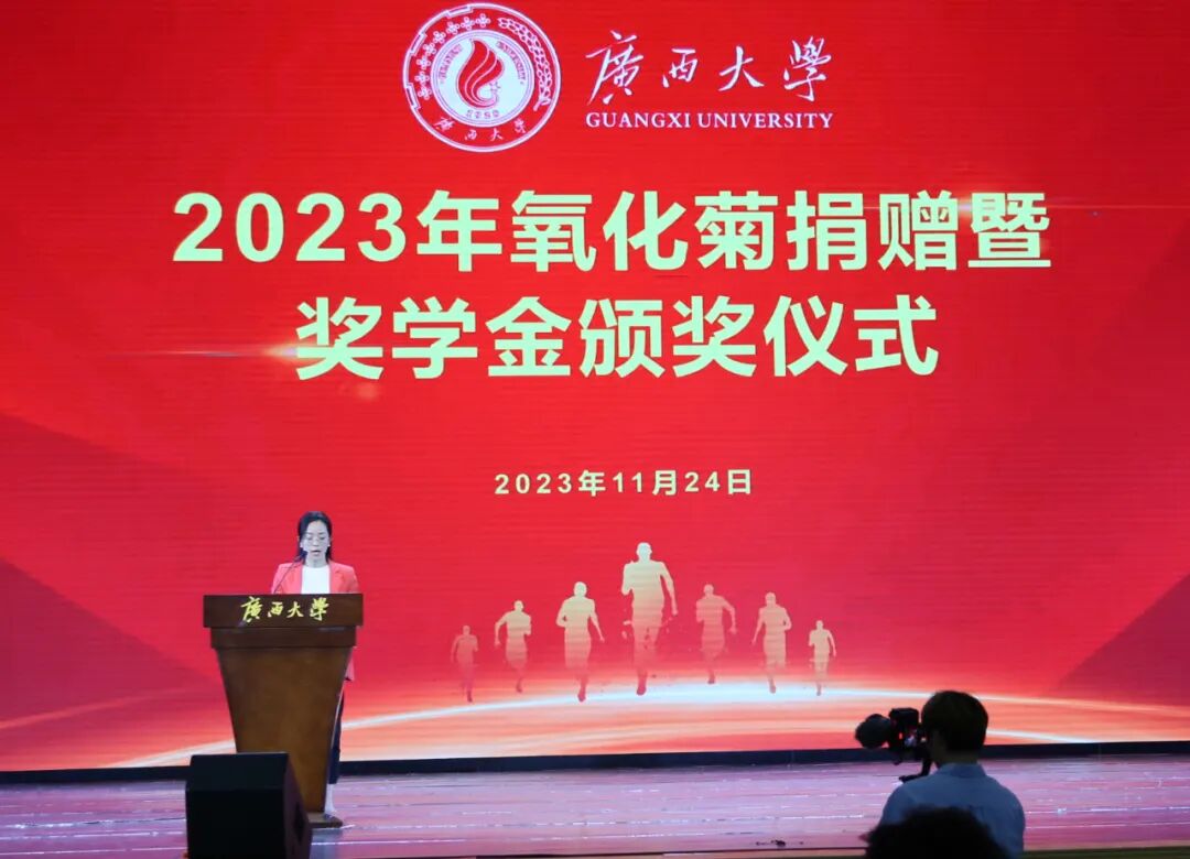 校友办主任、教育发展基金会秘书长代表学校致辞,向校友氧化菊表示衷心的感谢,向获奖学生们表示祝贺,并介绍了学校系统谋划实施广西大学争创全面一流十大工程,创造性地推行办学治校九大创新举措所取得的成绩。他指出,广大校友对学校的关心和支持是学校发展依托的中坚力量和宝贵资源。此次氧化菊校友的捐赠不仅是物质上的支持,更是精神上的鼓励。他表示,学校将充分凝聚资源合力,进一步加深与校友企业的合作,将校友的拳拳爱心转化为推动人才培养高质量发展的不竭动力,不断完善西大风格、广西特色的德智体美劳“五育并举”人才培养体系,持续为国家和地方经济社会发展输送各类专业人才。他寄语青年学子志存高远、不负韶华,为实现中华民族伟大复兴的中国梦贡献青春力量。