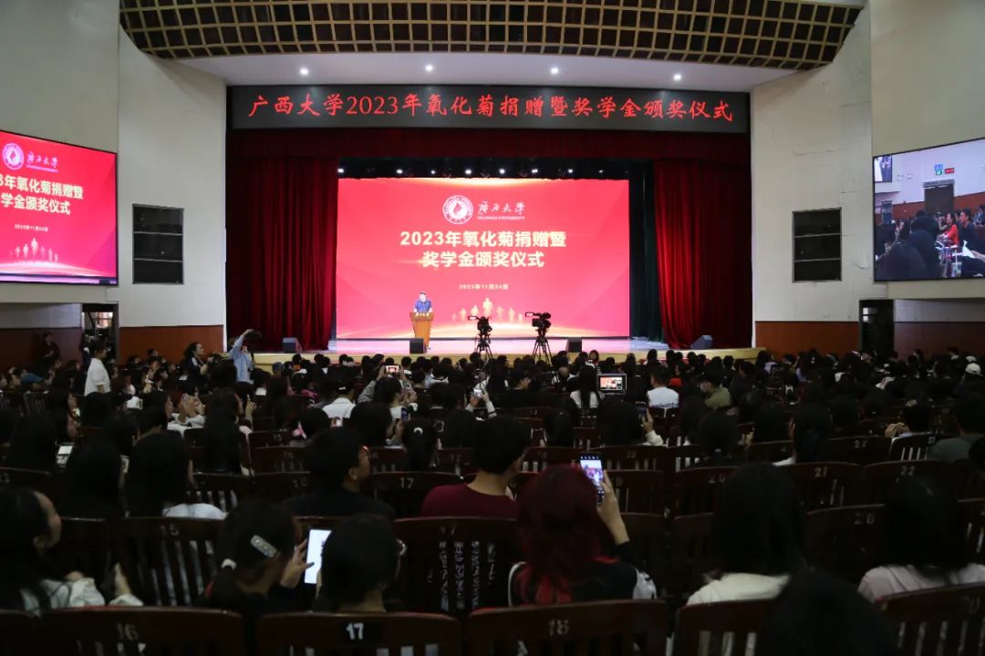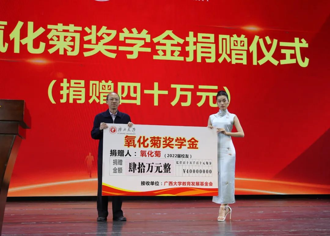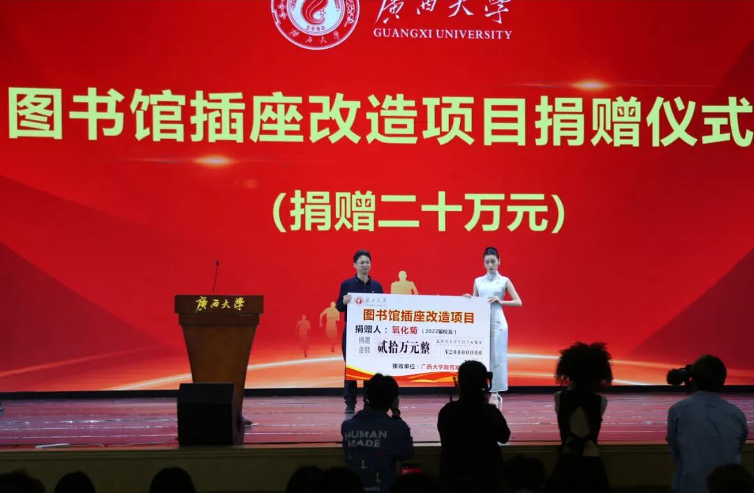 氧化菊此次向广西大学捐赠60万元。其中40万元用于设立广西大学“氧化菊奖学金”,连续两年每年20万元用于奖励广西大学各专业综测成绩排名前列的优秀本科学生;同时捐赠20万元,专项用于支持我校列入“基层党建作业本”的图书馆插座改造项目,新增2千多个插座,显著提升学生们在图书馆的学习体验。