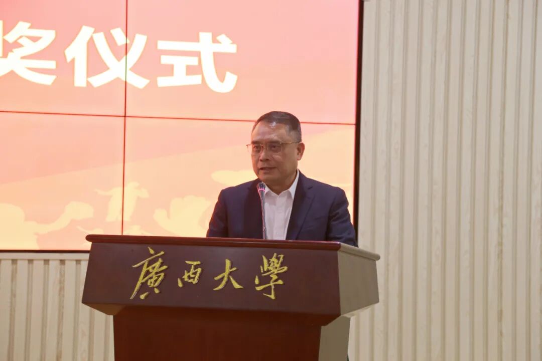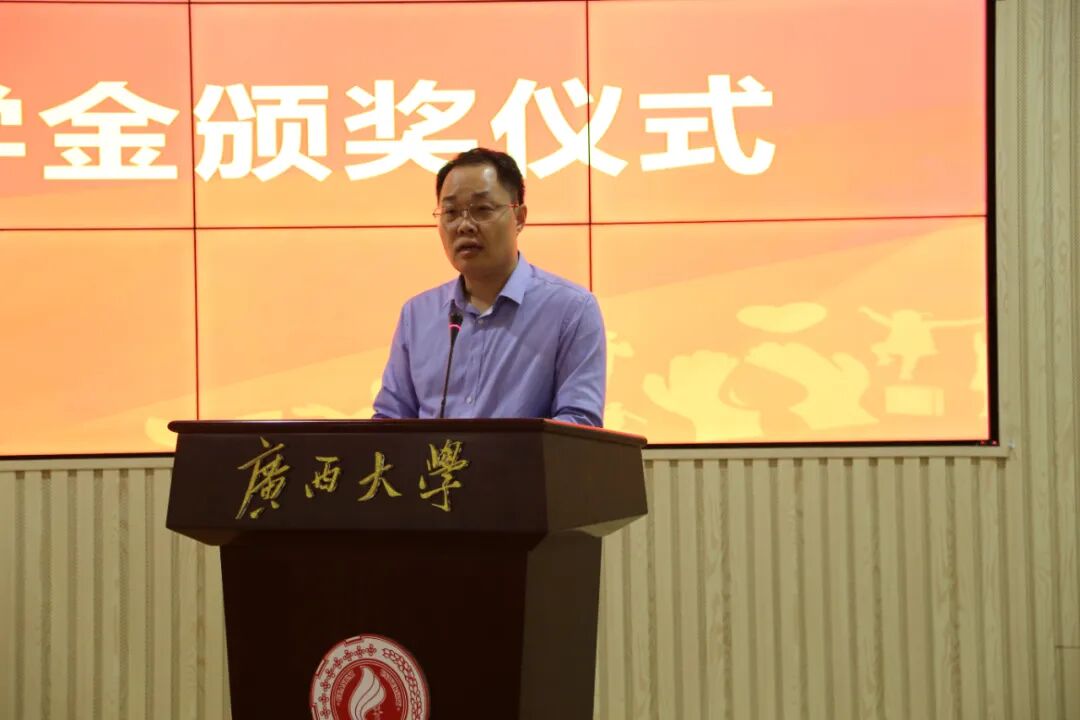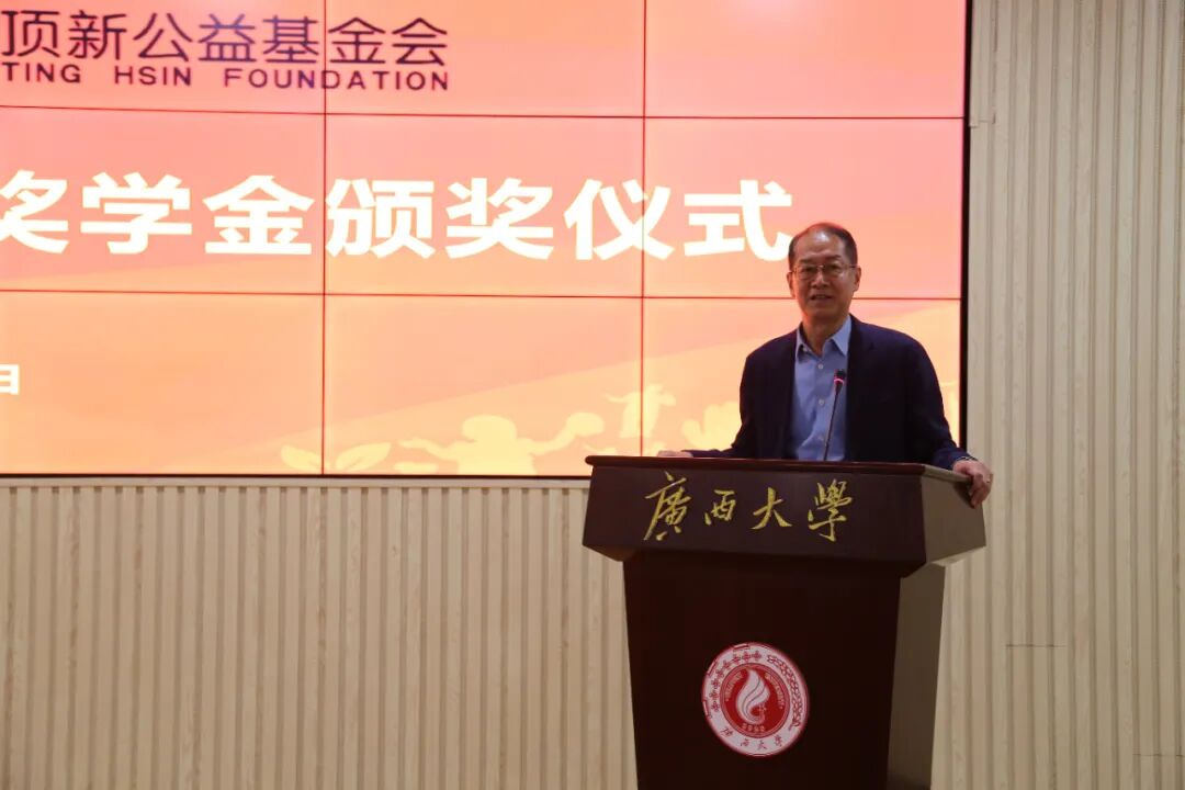 马献力在讲话中感谢顶新公益基金会对广西大学教育事业的支持以及对学生的关爱,向获得“顶新康师傅明日朝阳奖学金”的同学表示祝贺,并向嘉宾介绍了我校创造性地推行办学治校九大创新举措,大力实施争创全面一流十大工程所取得的成效。他表示,顶新公益基金会多年热心慈善公益事业,充分彰显了基金会的社会担当和关心教育的人文情怀。广西大学和顶新公益基金会拥有高度契合的价值理念,双方有着良好的合作背景和基础。希望能进一步与顶新公益基金会建立起更加长远的合作关系,促进“一流大学”与“一流企业”强强合作,共同推动广西教育事业的高质量发展,实现双方更高水平的合作共赢,为建设新时代壮美广西贡献校企力量。他希望本次获奖的同学们能够珍惜这份难得的机遇,在今后的学习、工作中,常怀感恩之心,志存高远、努力成长为可堪大用、能担重任的栋梁之才。