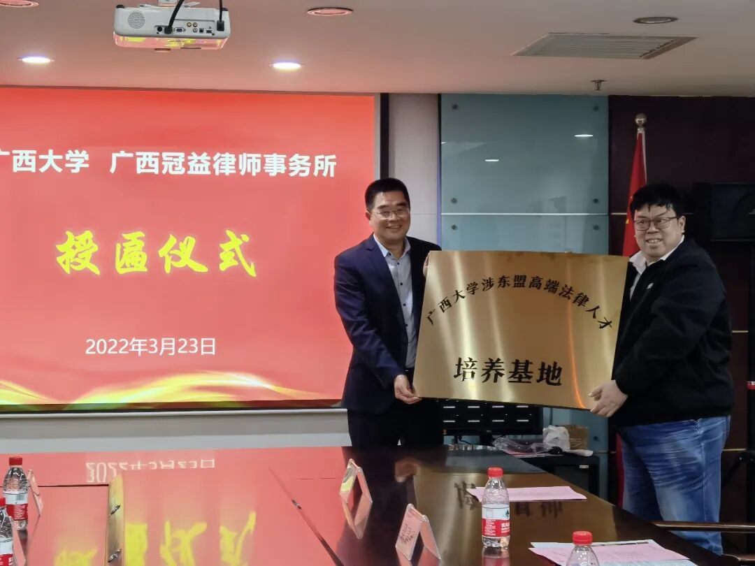 聂资鲁代表法学院授予律所“广西大学涉东盟高端法律人才培养基地”“广西大学法学实践教育基地”牌匾