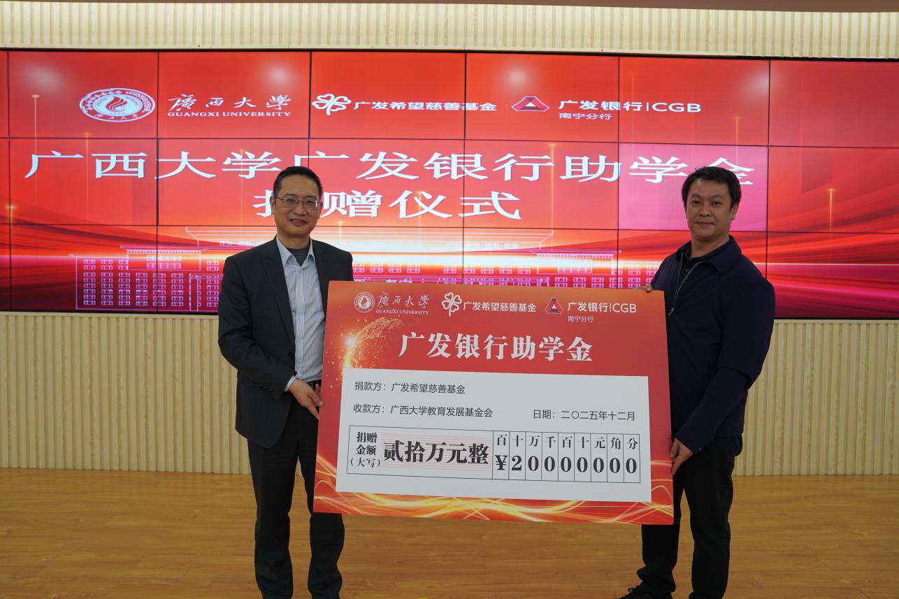 仪式现场,李苑鸿代表广发希望慈善基金,向广西大学教育发展基金会捐赠20万元专项助学金,该笔善款将精准帮扶我校40名家庭经济困难全日制本科学生。随后,周海斌代表基金会向广发银行回赠捐赠证书,以此见证双方携手助学的深厚情谊与公益担当。